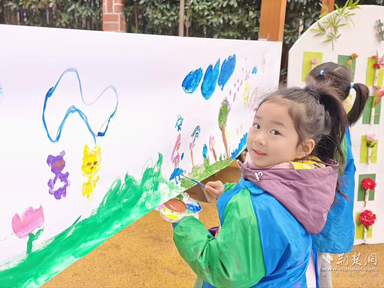全园活动中,大班幼儿的户外长卷创作成为亮点。孩子们围站在长卷旁,手握画笔分工协作,将眼中的春日盛景化作缤纷色彩,繁花、绿树、飞鸟跃然纸上,在集体创作中体会“移步换景”的传统艺术理念,感受合作之美,每一笔都饱含对春天的喜爱与对新学期的期待。