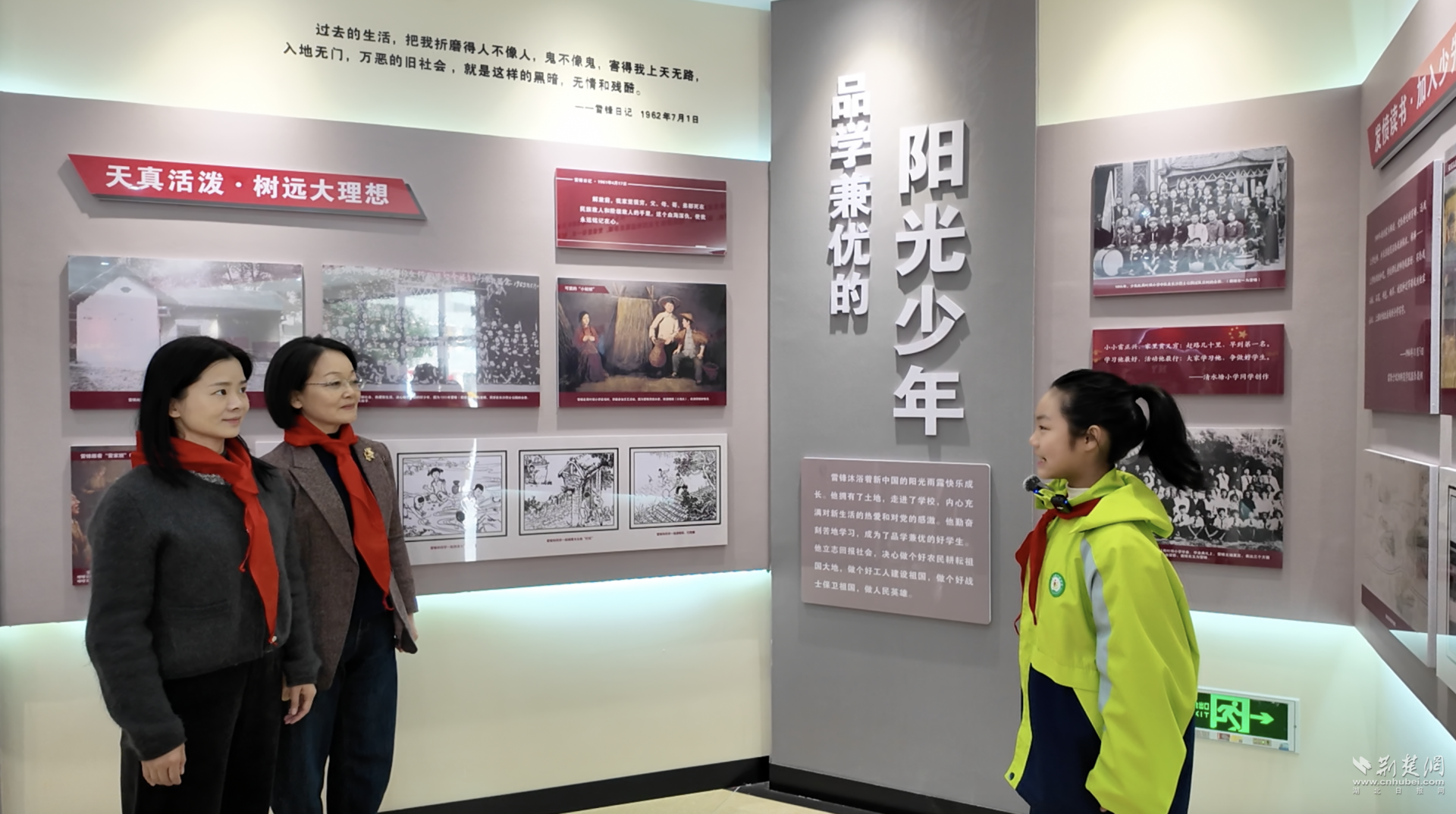 展区还设有郭明义、庄仕华、孙茂芳等“当代雷锋”事迹板块。物品陈列柜和书柜陈列着相关书籍与实物复制件。红领巾主题空间设有入队誓词、少先队发展史、师生作品展示等板块,向阳剧场可开展主题观影活动。