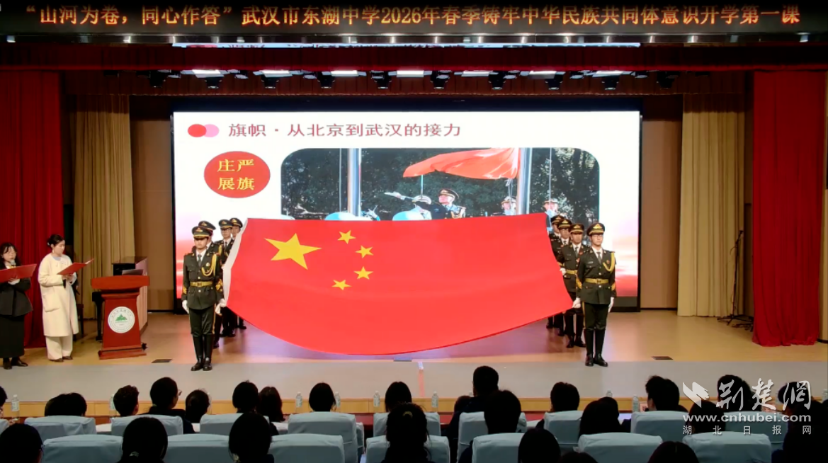 荆楚网(湖北日报网)讯(记者齐一璇 通讯员汤敏、熊奥蕾)春启新程,山河焕彩。3月5日,武汉市东湖中学开展2026年春季学期“山河为卷 同心作答”开学第一课。课程紧扣“行走归来话收获”主线,融合红色传承、民族团结、艺体特色与AI数字赋能,为师生带来一堂有温度、有深度、有力量的沉浸式思政大课,同时特邀戍边战士代表、优秀学生代表及家长代表齐聚现场,共同参与这场青春与信仰的对话,在春日校园凝聚起奋进力量。