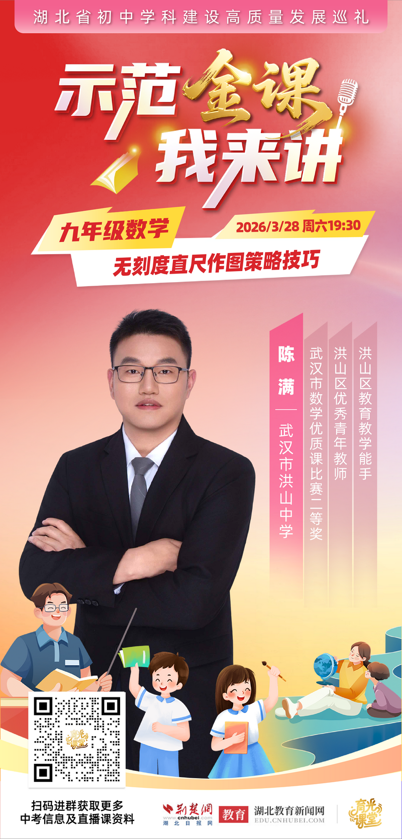 荆楚网(湖北日报网)讯(记者齐一璇)中考数学中,无刻度直尺作图是否让你倍感棘手?3月28日(本周六)晚7:30,武汉市洪山中学的陈满老师将携其“无刻度直尺作图策略技巧”走进“示范金课我来讲——湖北省初中学科建设高质量发展巡礼”活动,为你攻克这一中考热门题型。