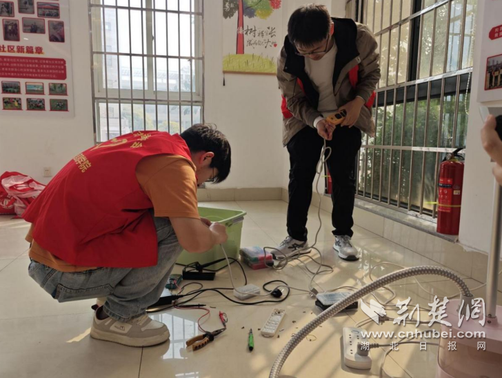 宣讲结束后,电气信息学院志愿者殷向阳开展安全用电科普课堂,讲解家庭用电安全常识、触电防护与应急处理等实用内容,通过“铁环过电圈”互动小游戏,引导小朋友在玩乐中了解用电知识。与此同时,志愿者们在社区居委会大厅设立义务电器维修服务点,提前通过社区开放预约,现场细心检查居民送来的电饭煲、熨烫机、小台灯等10余个日常家电,逐一排查故障、维修养护,把便民服务落到实处。