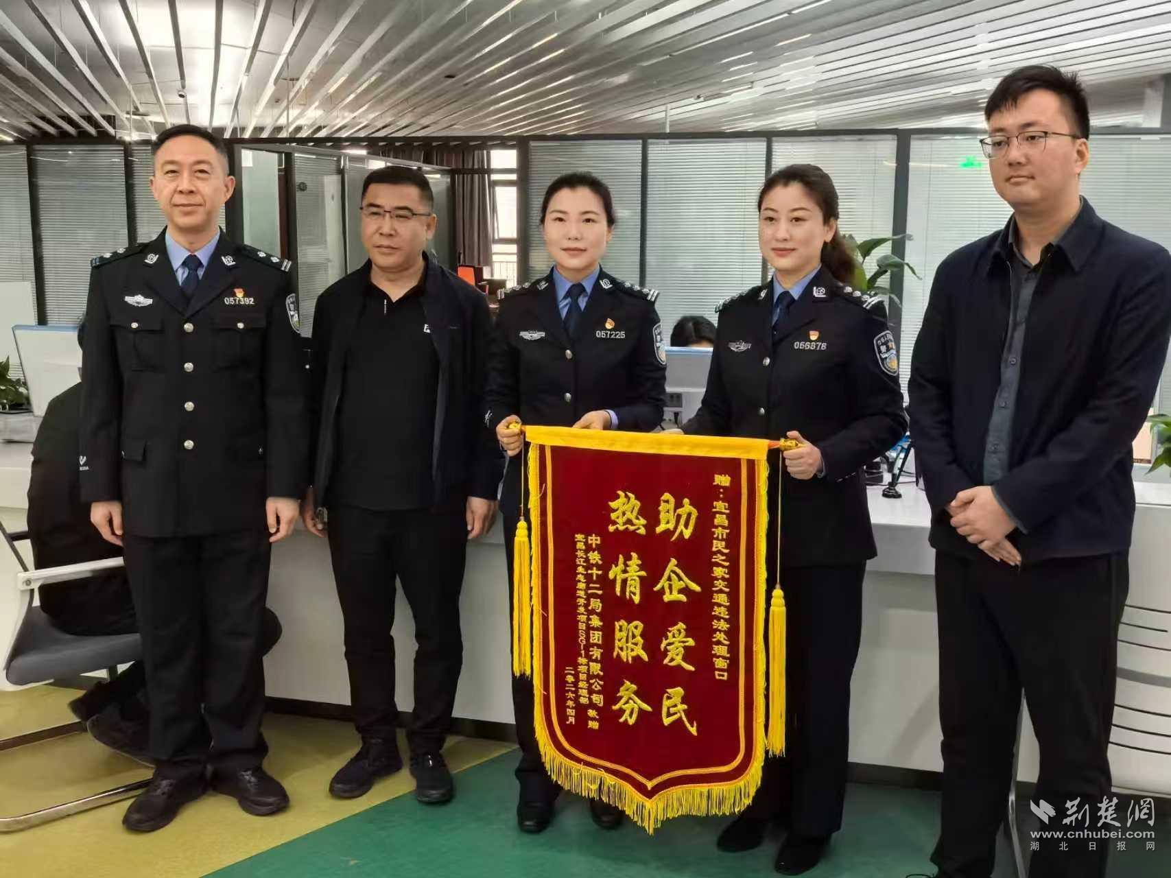 荆楚网(湖北日报网)讯(记者何青 通讯员姚华 殷钰)3月31日上午,在宜昌市民之家公安交管服务窗口,中铁十二局集团宜昌长江生态廊道开发项目SG-1标项目部总工程师与施工单位负责人,将一面写有“助企爱民 热情服务”的锦旗送到宜昌市公安局交管支队驻宜昌市民之家窗口民警田力手中。