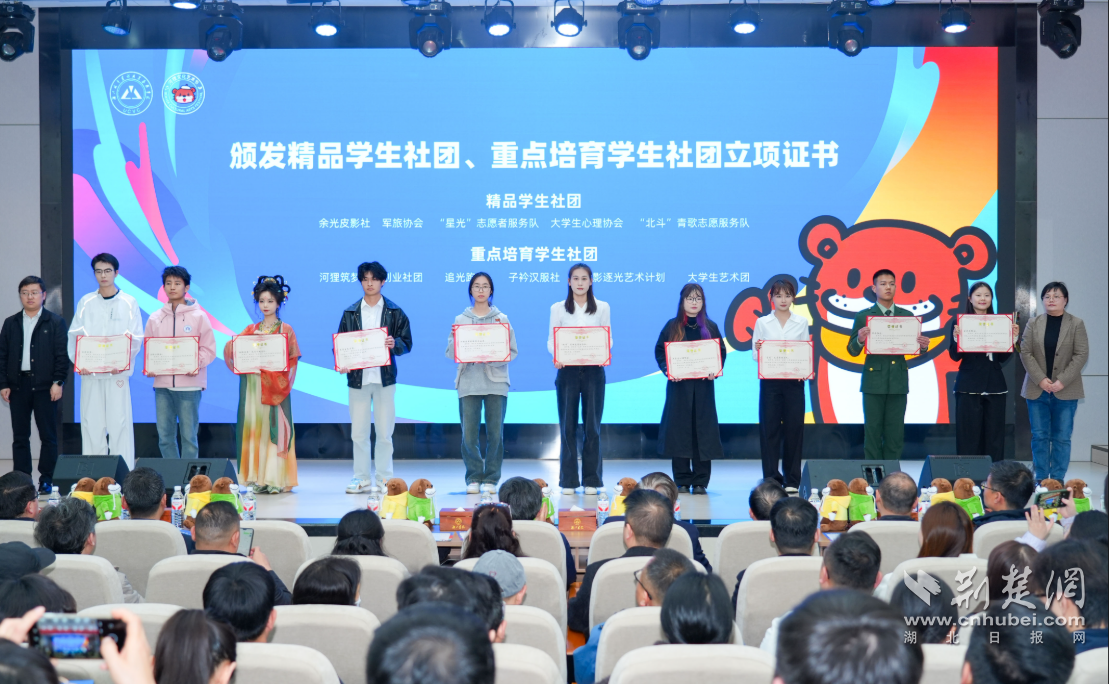 建院学子不仅在课堂里求知,更在社团活动中绽放光彩。学校社团是校园文化的活力源泉,也是第二课堂育人的重要载体。近期,湖北建院为推动社团品牌化、专业化发展,组织开展了2026年度精品学生社团评审答辩工作。开幕式上,学校为“精品学生社团”及“重点培育社团”授牌。
