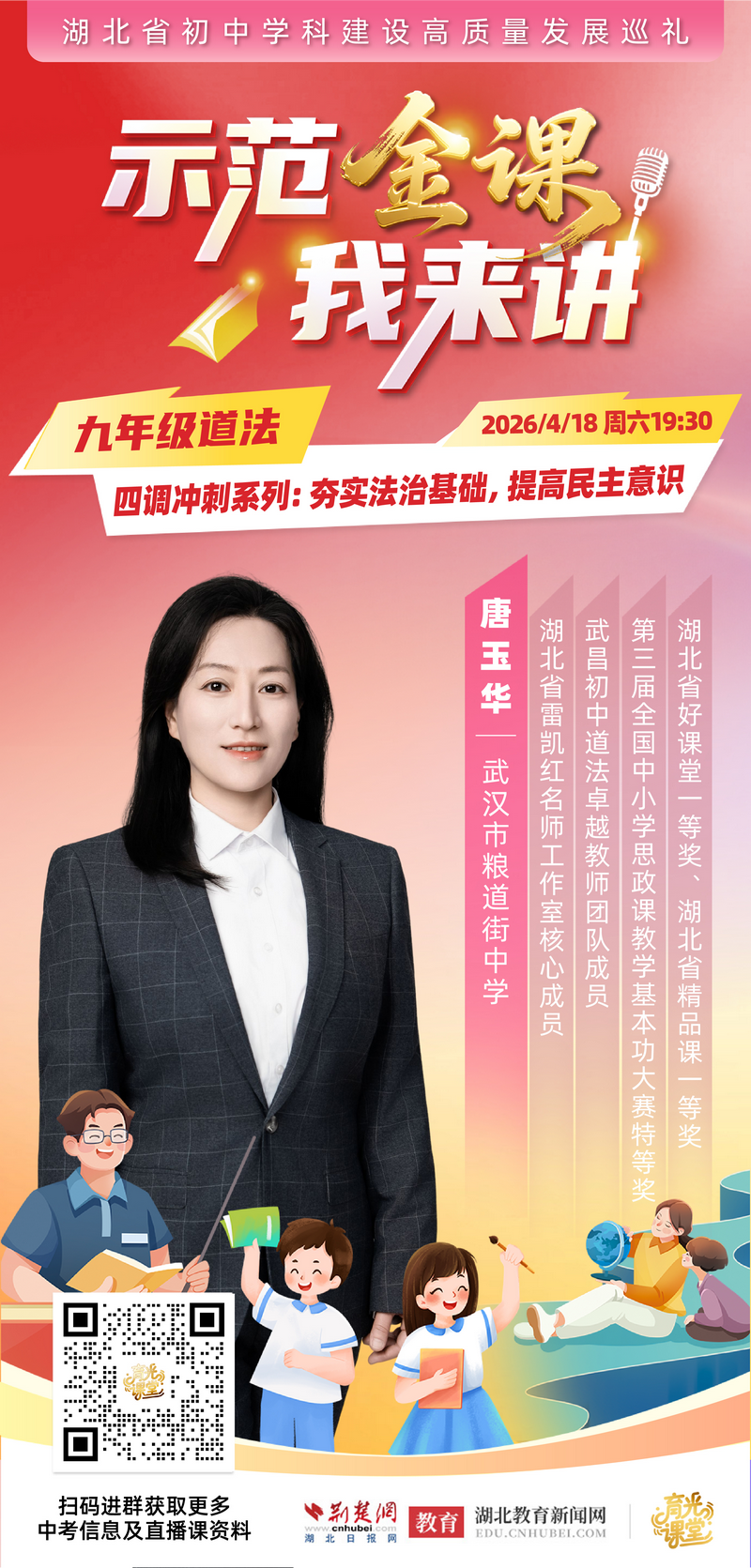 荆楚网(湖北日报网)讯(记者齐一璇)武汉四月调考临近,民主法治板块的知识点既是道法学科高频考点,也是学生易混淆、易失分的重难点。4月18日晚7:30,“示范金课我来讲——湖北省初中学科建设高质量发展巡礼”活动邀请武汉市粮道街中学道德与法治九年级教师唐玉华,带来“夯实法治基础,提高民主意识——道德与法治四调备考复习”,手把手帮学生高效备战。