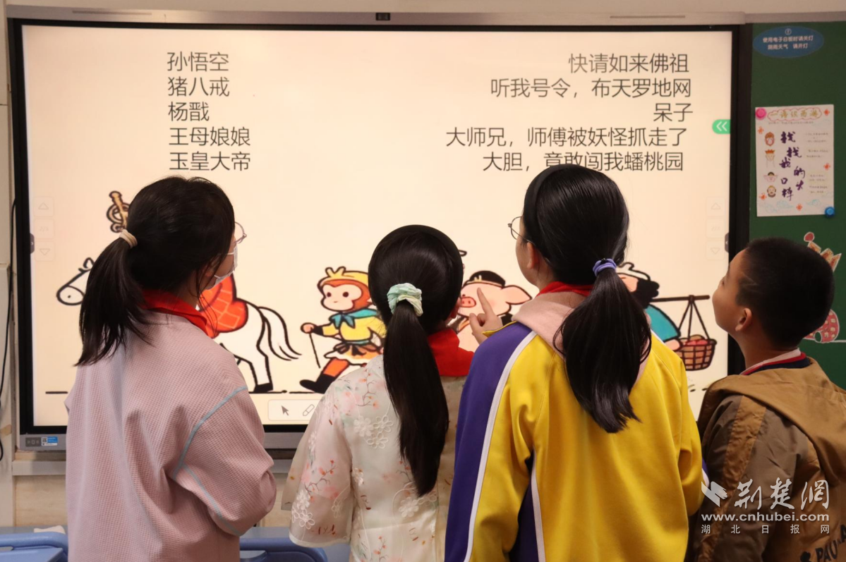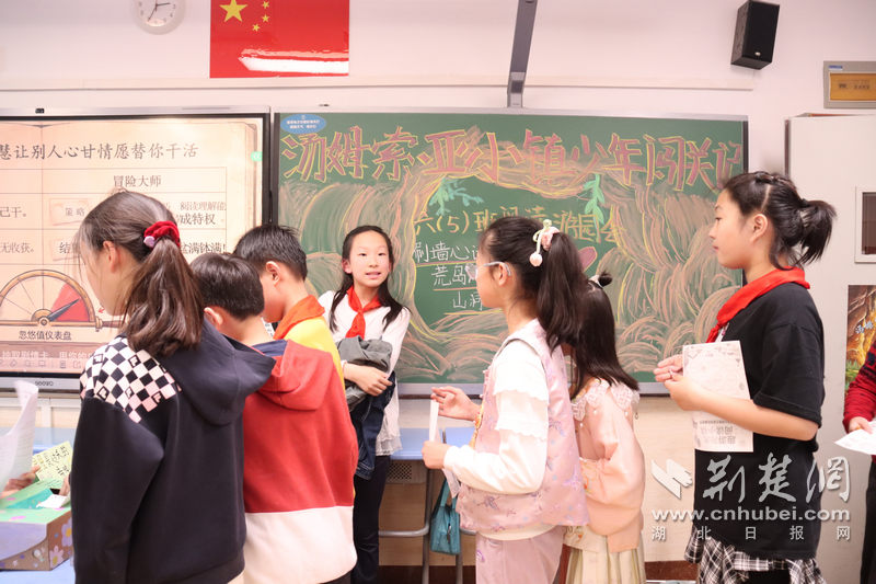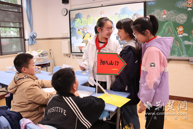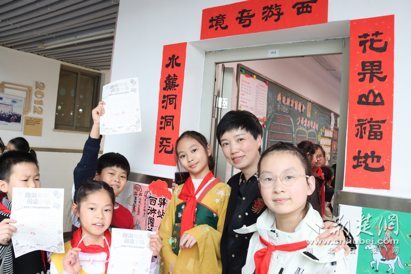 荆楚网(湖北日报网)讯(记者齐一璇 通讯员杨静、胡艳玲 摄影齐一璇)“花果山福地,水帘洞洞天!”“决定要离开荒岛,你们会先做哪三件准备?”四月春深,书香满园,阅读的绿苗在校园里拔节生长。4月23日下午,武汉市江岸区鄱阳街小学变成了一座“阳光阅读小镇”。作为该校第五届学科素养活动的核心与高潮,“趣游阳光阅读小镇”班级主题游园活动正式开启。