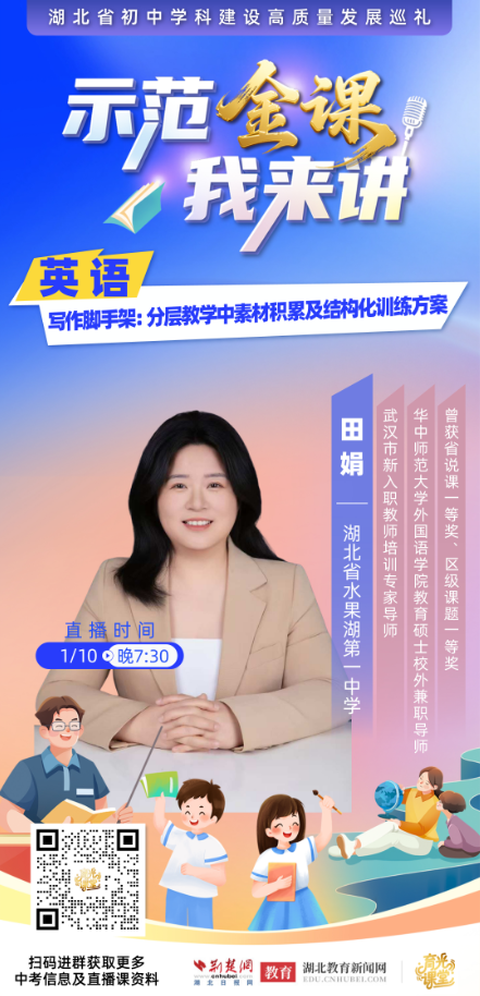 荆楚网(湖北日报网)讯(记者齐一璇)词汇量不足、语法薄弱、句子表达单一、篇章逻辑混乱……英语写作作为检验学生语言综合运用能力的重要环节,一直困扰着众多考生。1月10日晚,在荆楚网(湖北日报网)策划的“示范金课我来讲——湖北省初中学科建设高质量发展巡礼”活动中,湖北省水果湖第一中学的田娟老师以其独创的《写作脚手架:分层教学中素材积累及结构化训练方案》,为师生们带来了一场破解中考英语写作难题的“智慧风暴”。